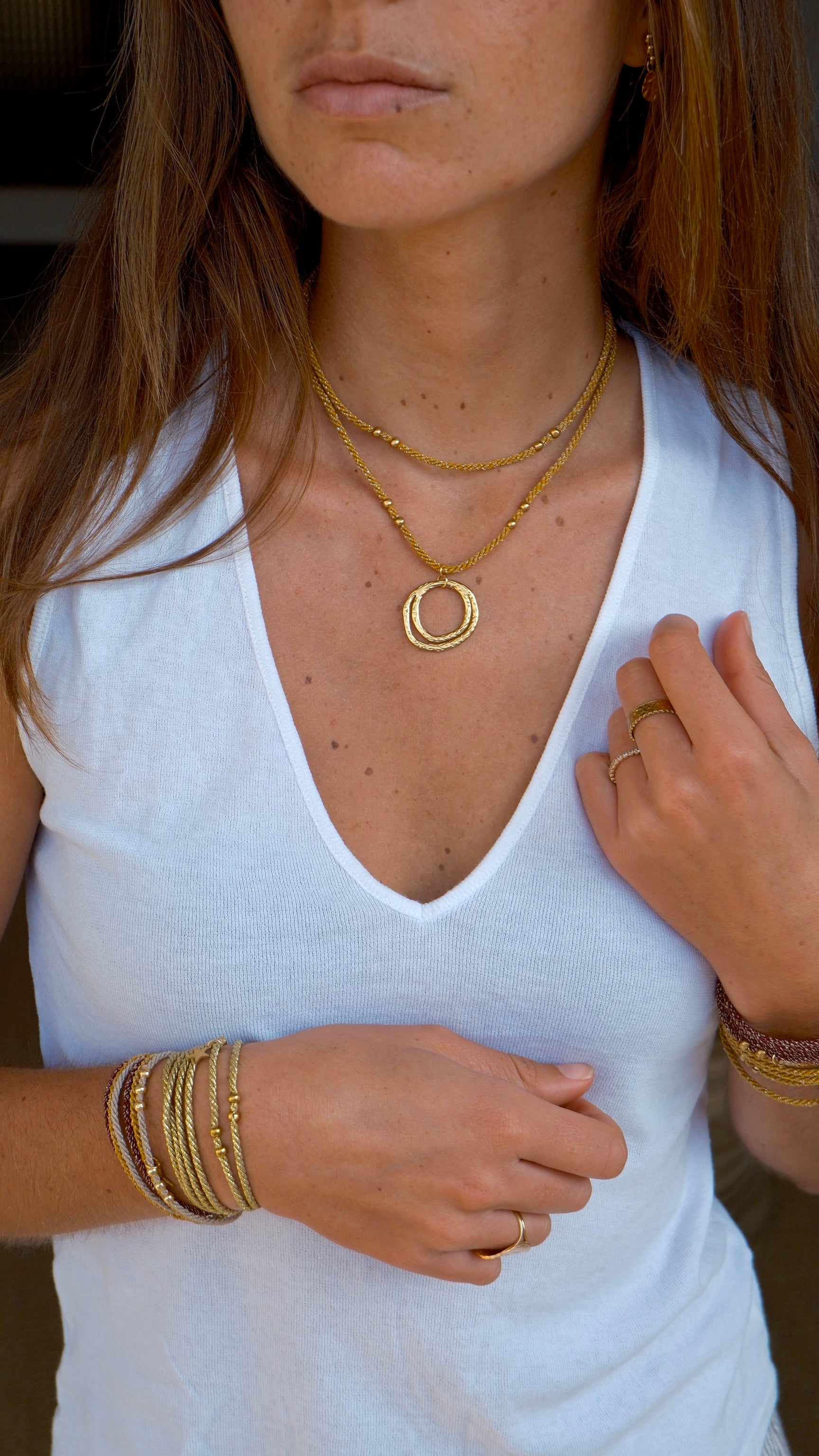 Double tour raffiné, 8 perles et pendentif double cercle inox.